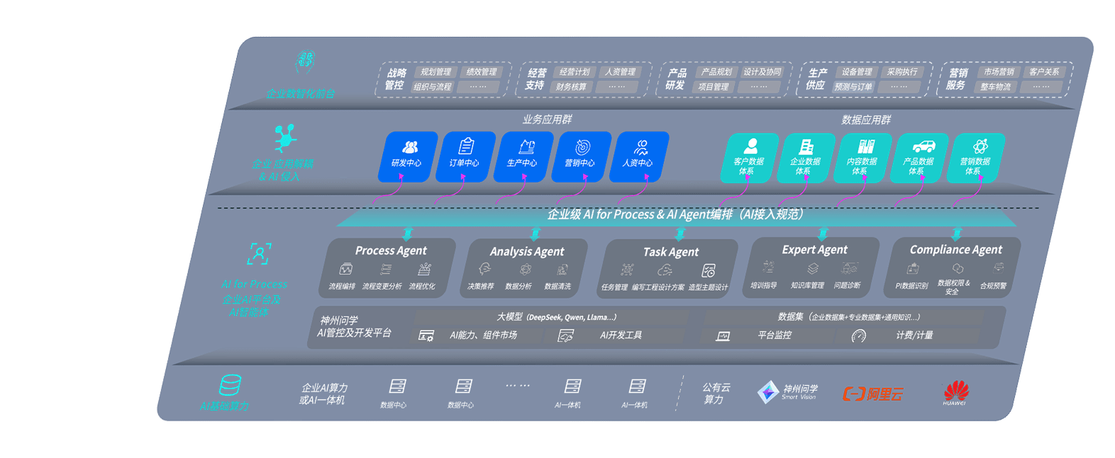 端到端的一站式AI工作空间深度融合了从企业战略规划到日常经营的全流程业务板块,,,,定向解决车企内部领域多、、部门多、、、链条长、、场景碎片化等难题,,,,支持车企快速构建以AI为核心的生产力写作体系,,,,实现任务执行与AI能力的无缝集成与交互